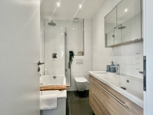 Das Badezimmer mit Badewanne und großzügigem Waschtisch lädt Dich ein, den Tag entspannt ausklingen zu lassen. Hochwertige Pflegeprodukte, bezogene Betten und flauschige Handtücher erwarten Dich bereits bei Deiner Ankunft – für einen entspannten Start von der ersten Minute an.