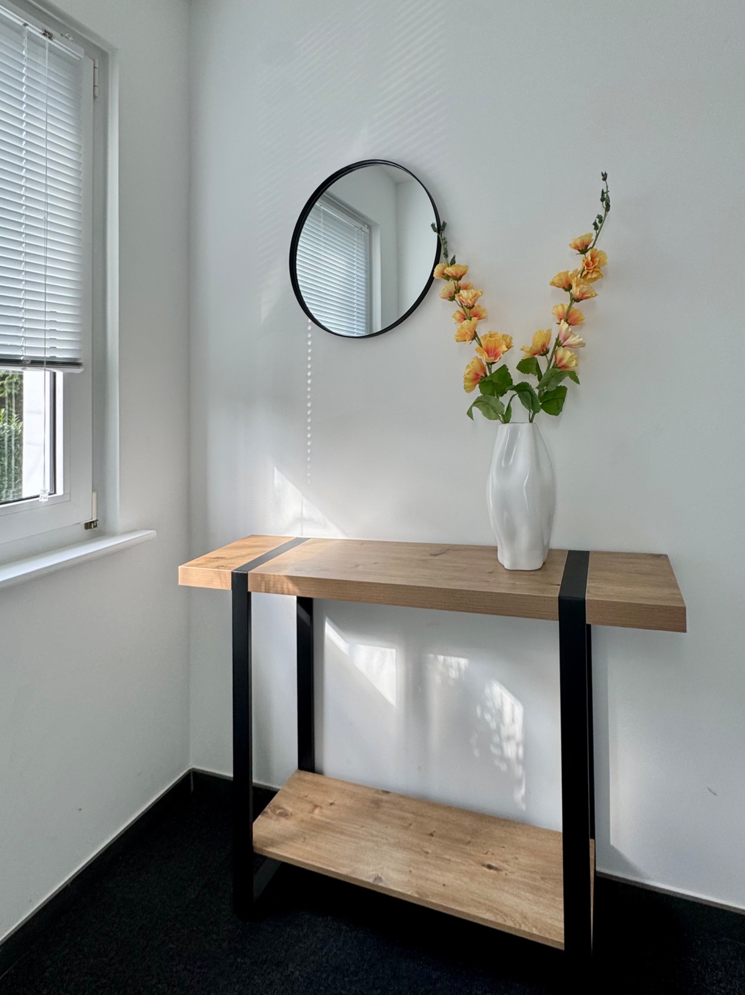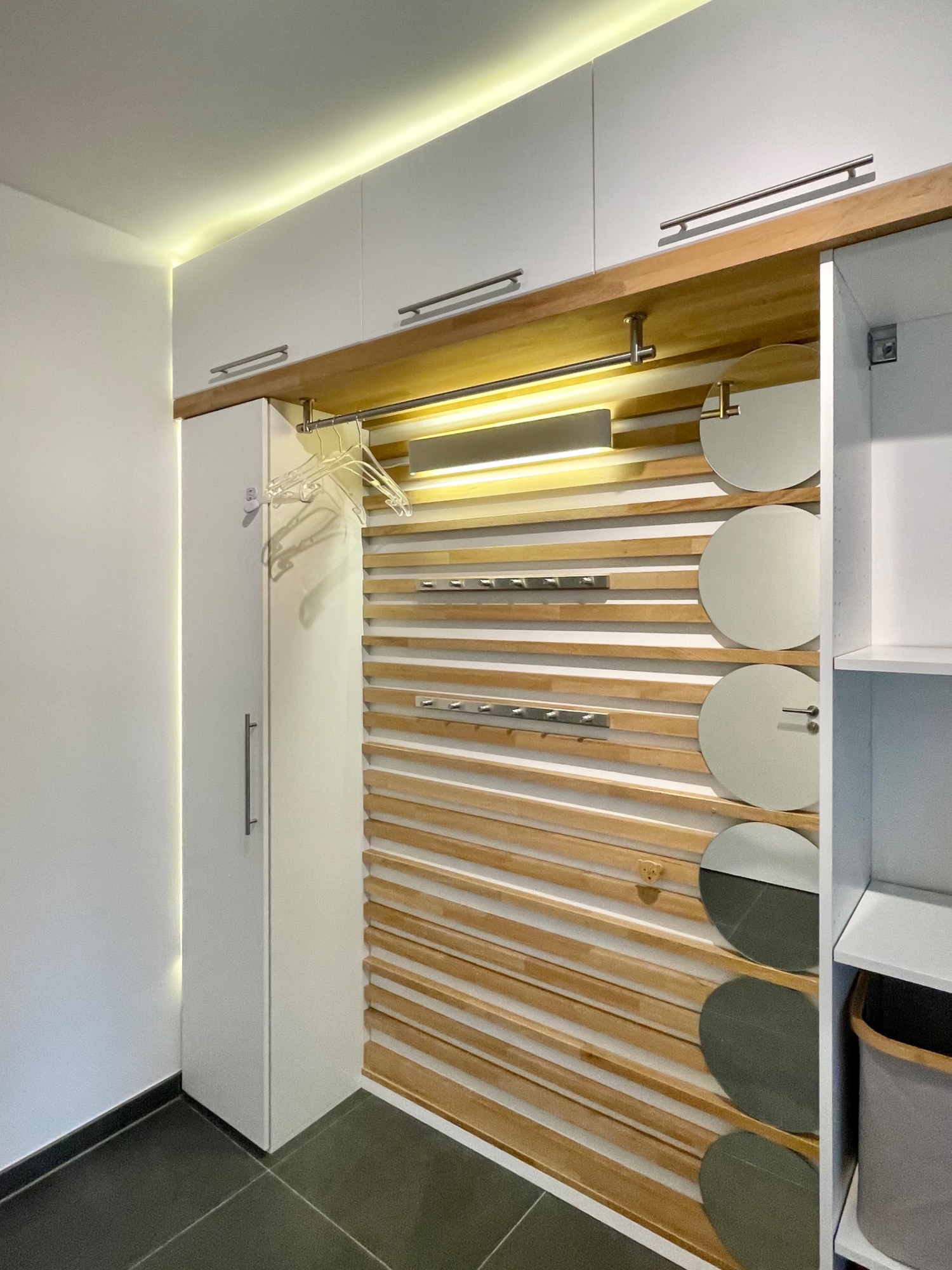 Der großzügige Eingangsbereich empfängt Dich mit einer handgefertigten Design-Garderobe, integriertem Spiegel und stimmungsvollen Lichtelementen – ergänzt durch eine bequeme Sitzgelegenheit und praktische Ablageflächen. Ein stilvoller Auftakt, der Dir sofort das Gefühl von Zuhause vermittelt.