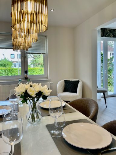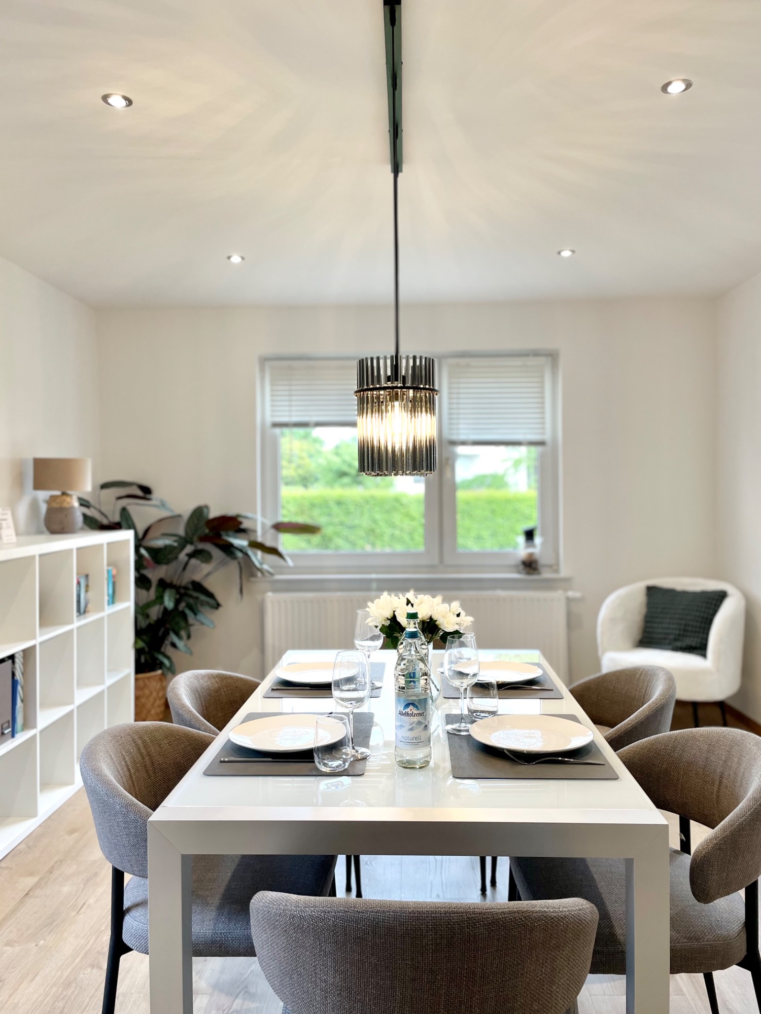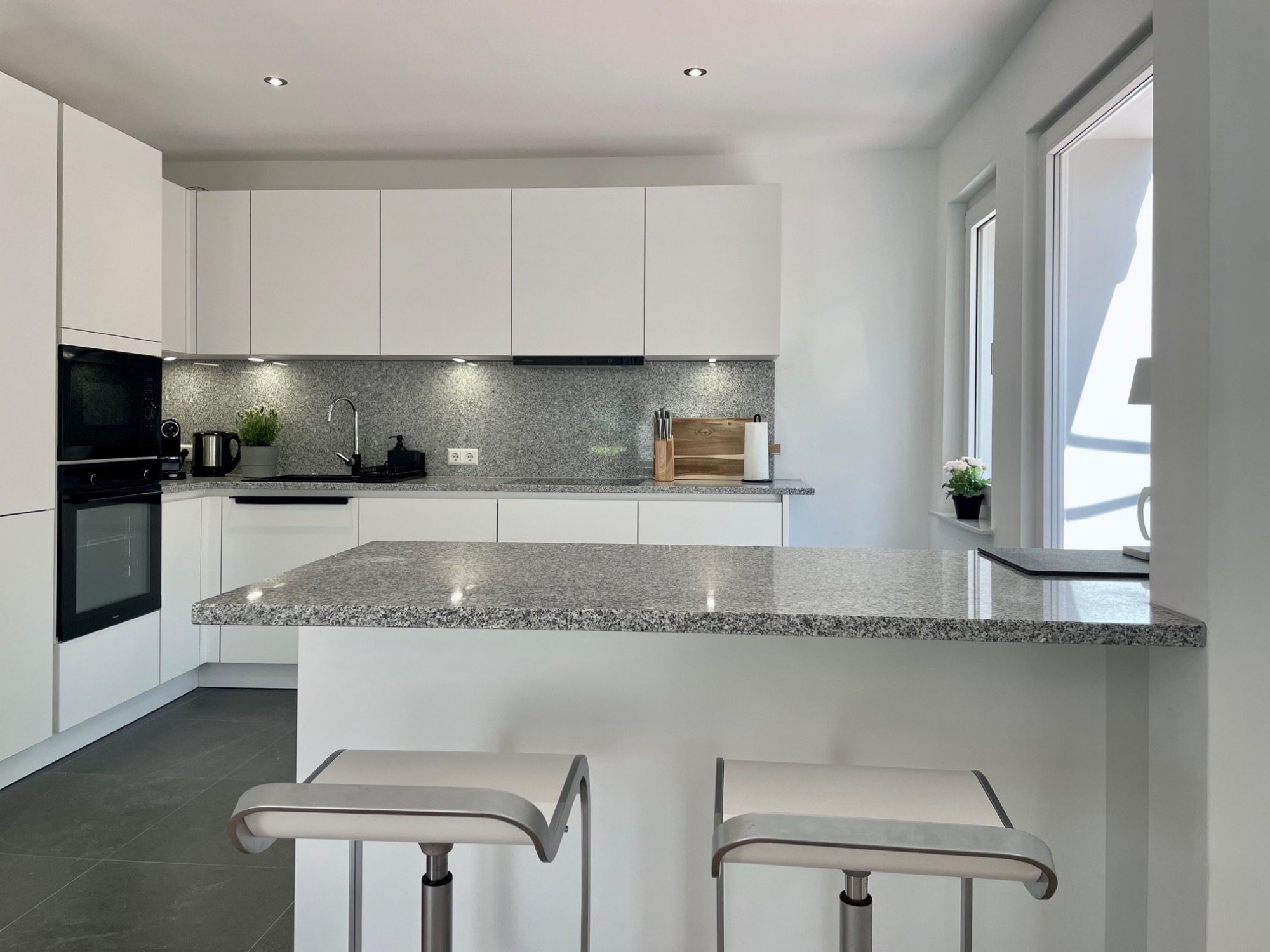 Der offen gestaltete Wohn- und Essbereich bildet das Herz des Hauses. Die voll ausgestattete Küche mit hochwertiger Granit-Arbeitsplatte fügt sich harmonisch in das Raumkonzept ein und verbindet Funktionalität mit Design. Zwischen Küche und Essbereich befindet sich eine Kücheninsel mit Barhockern - ideal für entspannte gemeinsame Kochabende oder einem schnellen Espresso zwischendurch. Am einladenden Essplatz mit dimmbarer Beleuchtung finden bis zu sechs Personen bequem Platz; der Tisch lässt sich bei Bedarf auf acht Plätze erweitern – ideal für gemeinsames Zusammensein mit Familie, Freunden oder Kollegen.