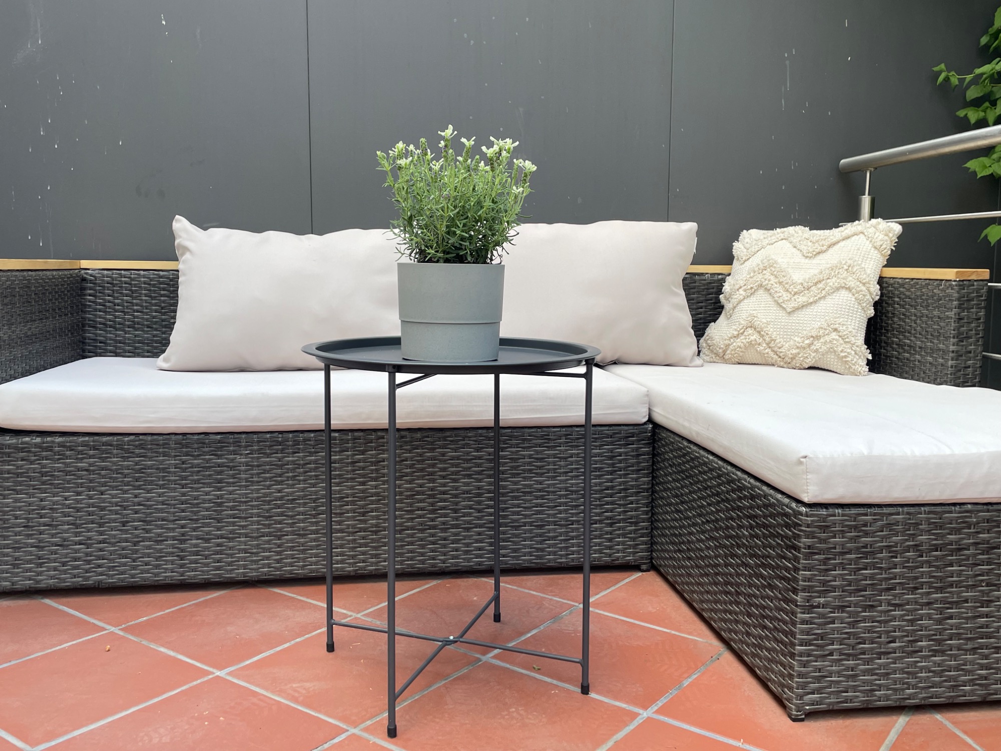 Auf der kleinen Terrasse direkt am Haus laden komfortable Loungemöbel zu ruhigen Stunden im Freien ein, während ein Sonnenschirm bei Bedarf angenehme Beschattung spendet. Eine Kellertreppe führt Dich zur Waschküche, es besteht die Möglichkeit, Wäsche statt im Trockner bequem draußen zu trocknen.