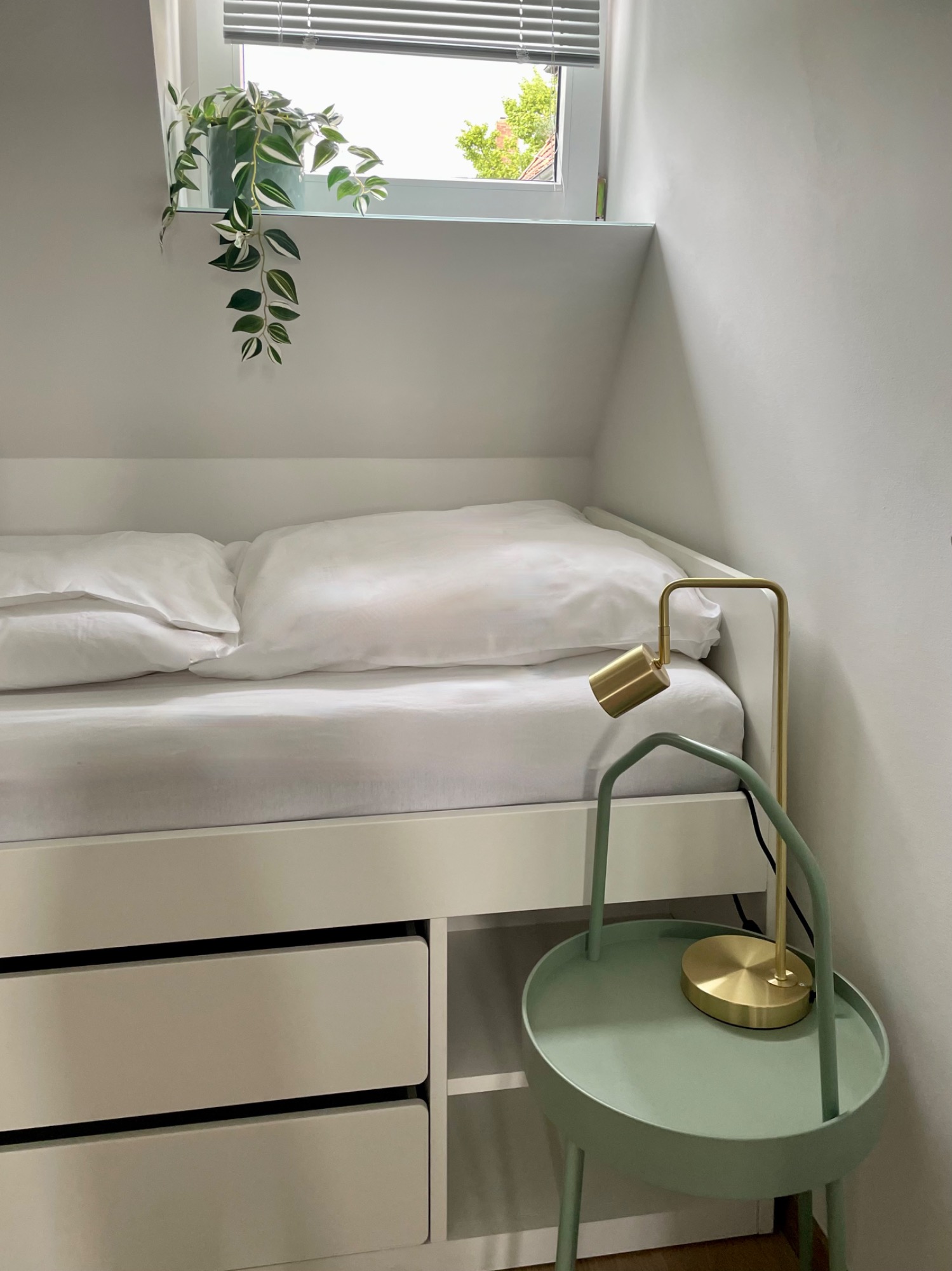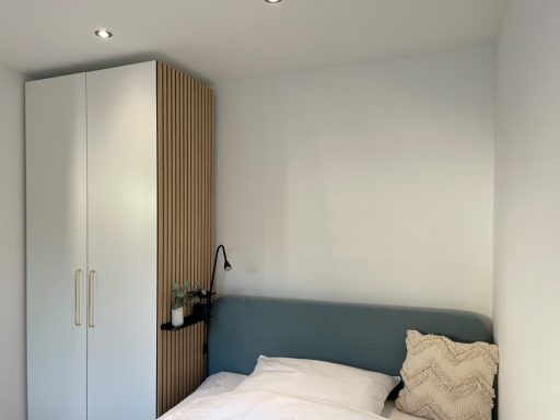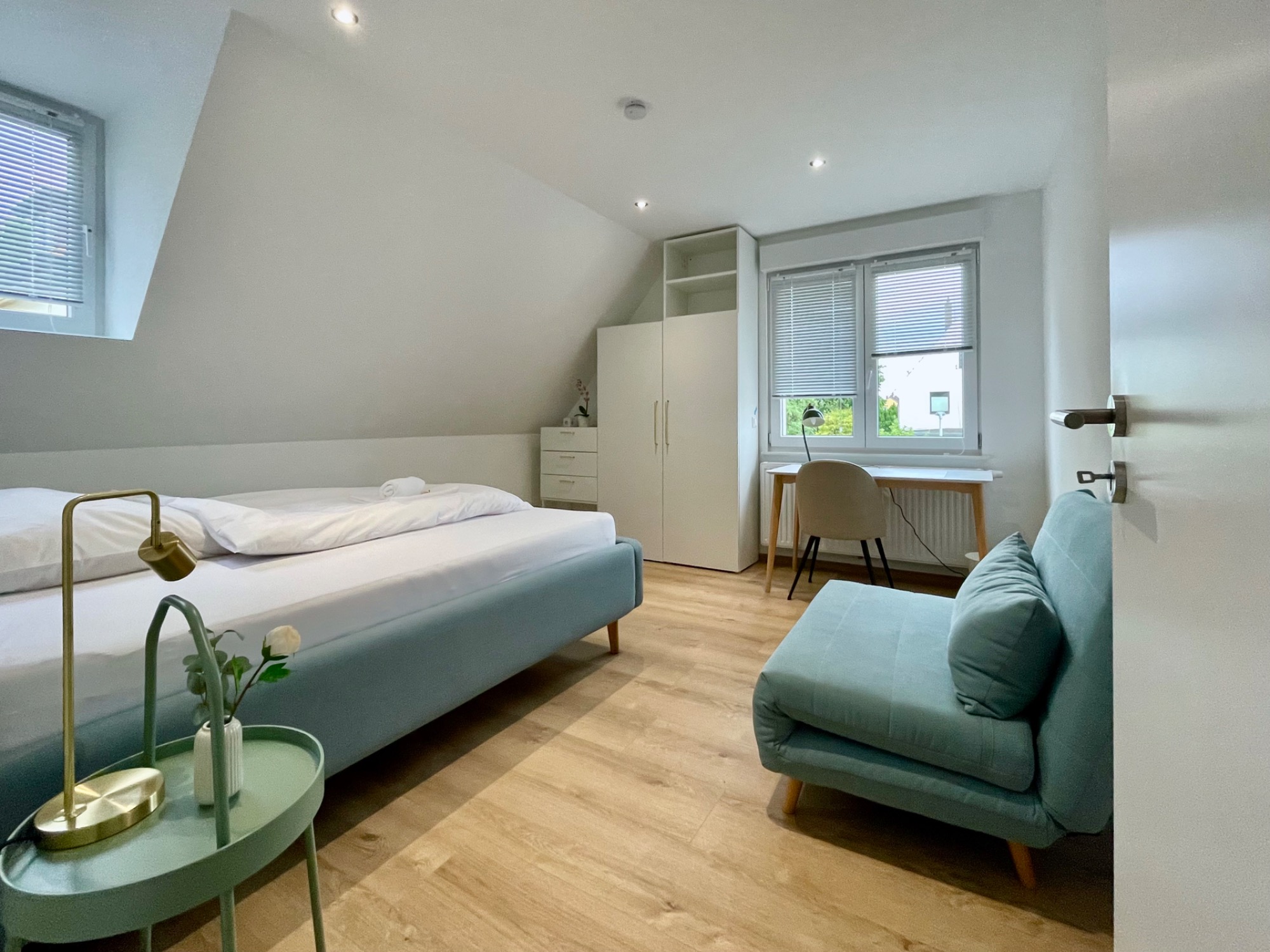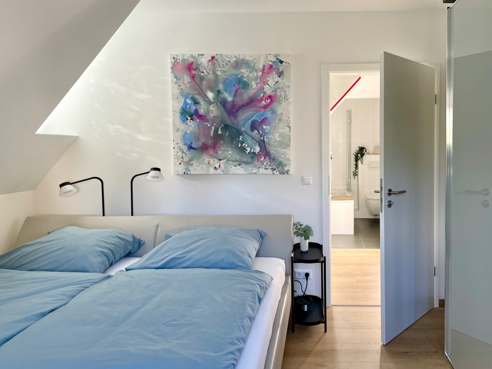 Ein klares, ruhiges Design in sanften Hellblau- und Türkistönen verleiht den Räumen eine entspannte Leichtigkeit, während die Dachschrägen eine besonders behagliche Atmosphäre schaffen. Ablageflächen, stimmungsvolle Lichtakzente und hochwertige Verdunkelung – mit elektrischen Rollläden und Jalousien in zwei Zimmern sowie einem maßgeschneiderten Rollo im Dachfenster – schenken Dir jederzeit Rückzug und erholsame Ruhe.