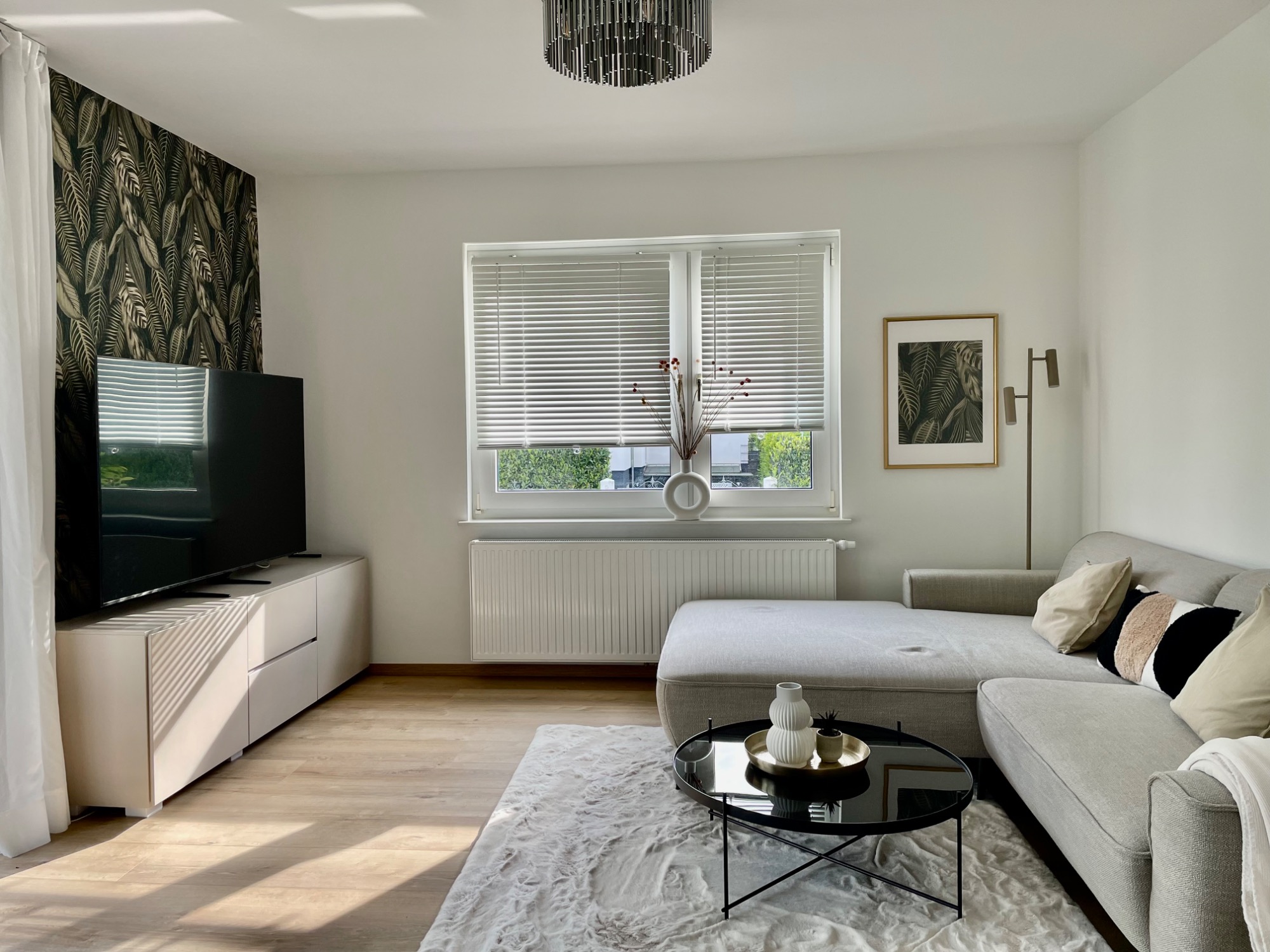 Im Wohnbereich schafft das großzügige Lounge-Sofa eine entspannte Atmosphäre, während der große Smart-TV (Netflix inklusive) für Unterhaltung sorgt. Der rund 320 qm große Garten ist über zwei Ausgänge - vom Wohnzimmer und Küche erreichbar – ein fließender Übergang zwischen Innenraum und Natur. Die Farbgestaltung im Wohn-Essbereich mit Grün-, Braun und Naturtönen ist der Natur im Garten angepasst. Zwei einladene Terrassen bieten viel Raum zum Entspannen oder für gesellige Runden, ein privater PKW-Stellplatz befindet sich auf dem Grundstück.